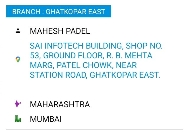 Address: Mahesh Enterprises, 53, SAI INFOTECH, RB Mehta Rd, Patel Chowk, Saibaba Nagar, Pant Nagar, Ghatkopar East, Mumbai, Maharashtra – 400077
